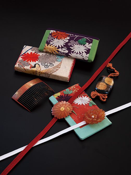 お母様から譲られたコレクションから、菊尽くしの筥迫、漆に金蒔絵の菊が優美な櫛に根付、漆と鼈甲の帯留めなど。同じ菊をテーマにしながらも、描き出されている世界観は実に多様だ。