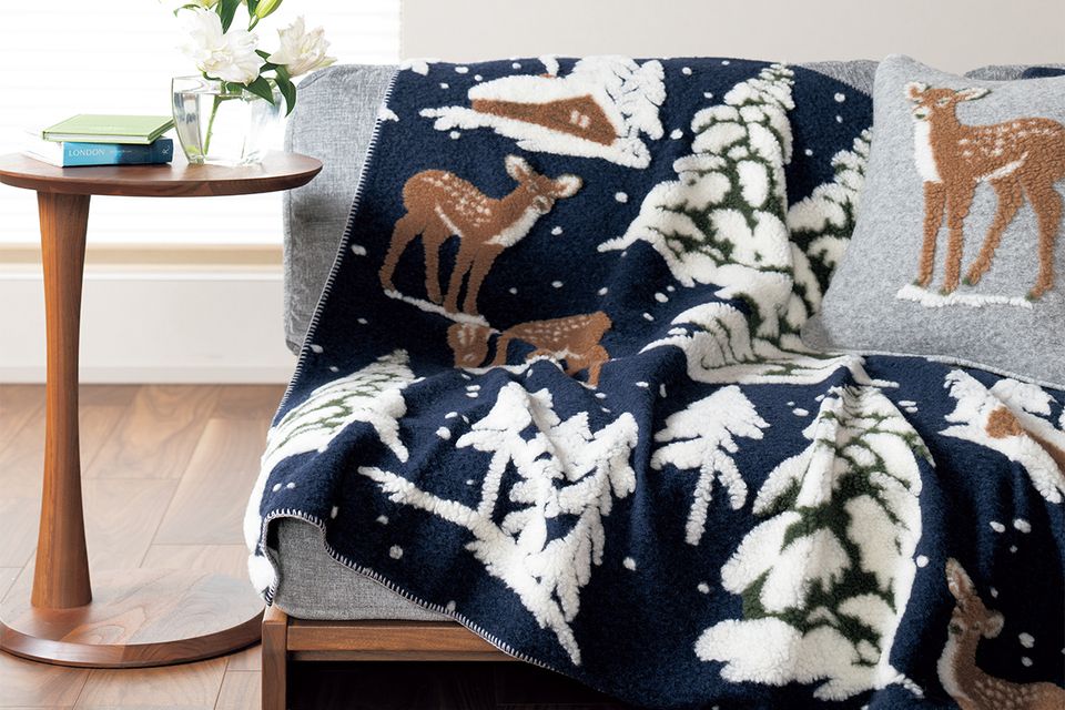 毛織物の産地として有名な北イタリアのビエラ地区で作られるブランケットとクッションカバー。お湯に通したウール繊維を密に絡み合わせる縮絨(しゅくじゅう)加工を施し、耐久性と保温性に優れていながら軽量で柔らかな触り心地。ブランケットには雪景色の森とトナカイが描かれ、クッションカバーは片面がトナカイ、もう片面が家の絵柄です。