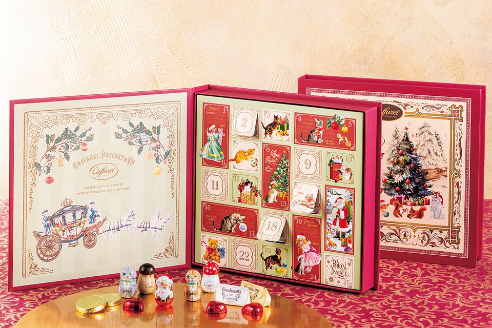 イタリアの老舗チョコレートブランド「カファレル」のアドベントカレンダー。アンティークショップに並ぶ絵本をイメージし、ほっこり心温まる物語を表現しました。サンタのホイルチョコレートやブランドの代表商品ジャンドゥーヤなど、種類豊富な25粒が楽しめます。