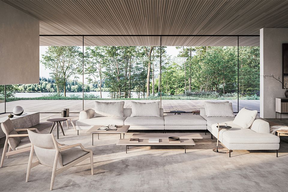一人掛けや二人掛けソファ、長椅子、足置きとバリエーションも豊富で、空間に合わせ自在に組み合わせが可能。張り地は豊富なオリジナルファブリック、レザーから。幅198×奥行き99×高さ83センチの二人掛けソファで88万5500円~。