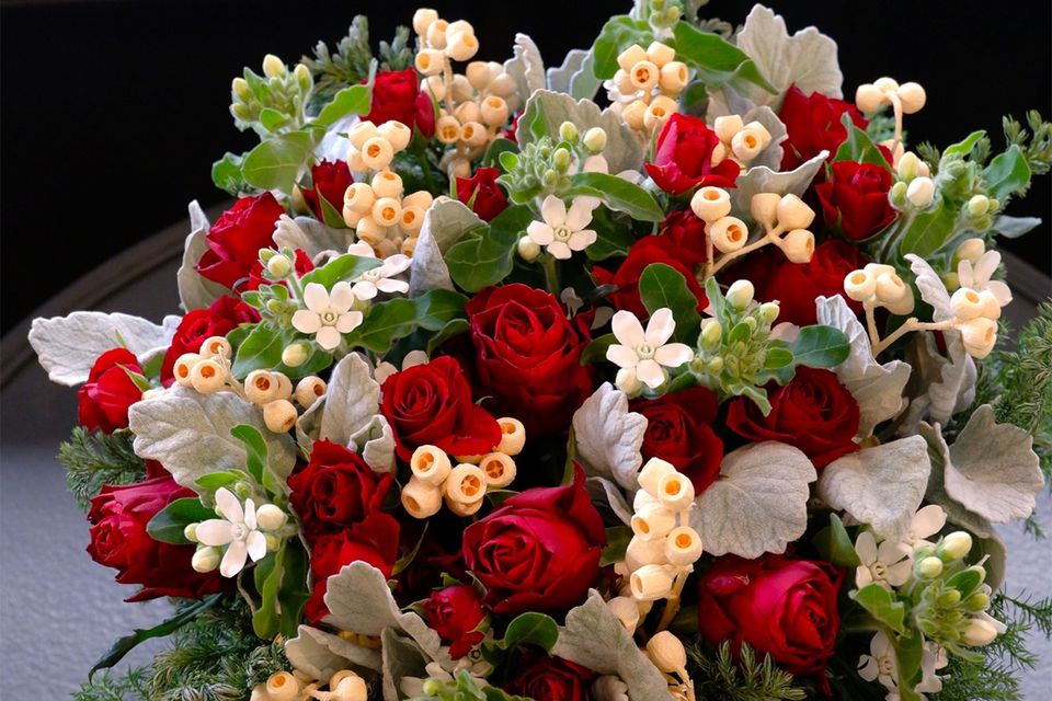 気品も感じさせる赤バラ‘ブリランテ’と‘ルビーブリリア’を使ったアレンジ。アクセントに加えた小さな白花はオキシペタルム‘マーブルホワイト’。赤×白×緑のクリスマスカラーですが、ユーカリの実のアンバーナッツのかわいらしい形、優しい色合いが加わるとぐっと個性的な雰囲気になります。ほかにダスティーミラー、コニファーを使用。