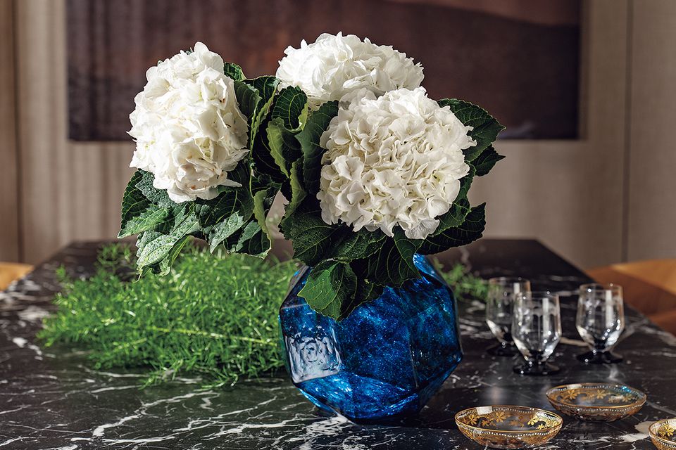 白の大輪紫陽花を入れてダイニングテーブルの中央に。花器にしっかりした重みがあるため、ボリュームのある花も安定していけられる。