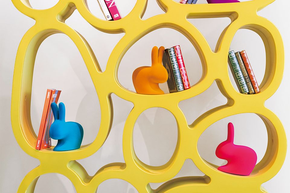 ユーモアと驚きに満ちたデザインは、見る人や使う人の創造性を刺激します。ブランドのアイコンである「ラビットチェア」(写真の左)は、ウサギの耳を背もたれにしても、反対を向いて耳をかかえるようにしても、快適な座り心地で屋外でも使えます。