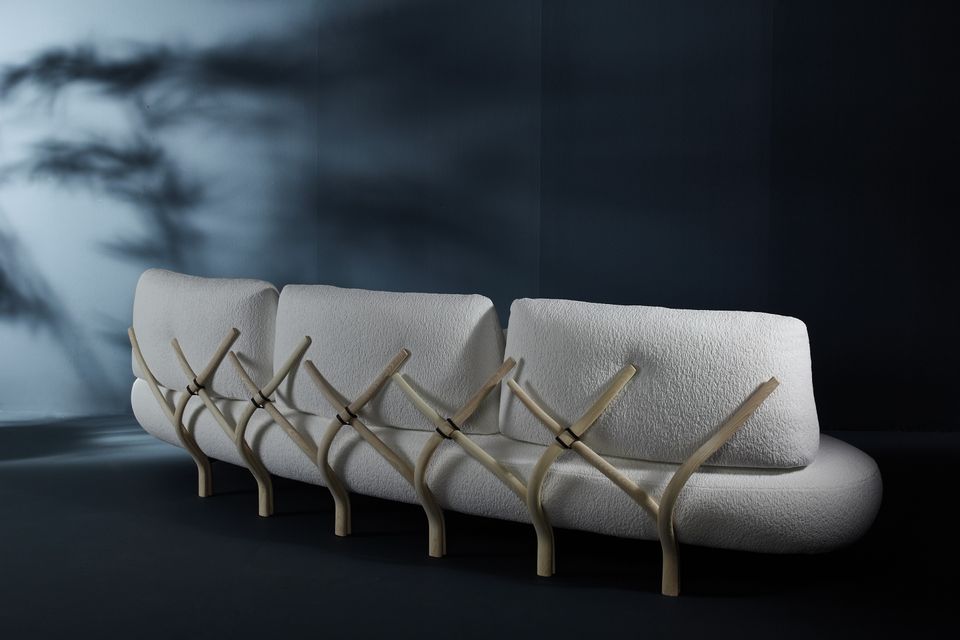 枝のような木製のフレームが目を引く独創的なソファ。2023年のミラノサローネで発表されました。優れた木工技術を持つ同ブランドならではのデザインです。