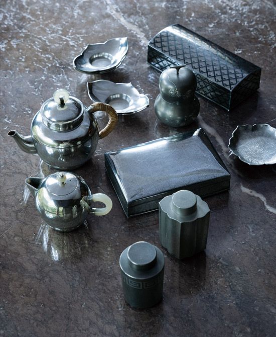 ひと目見た瞬間に心惹かれた翡翠玉が付いた急須や茶入れ。京都の清課堂の煎茶道具や錫製のアンティークは、惜しげもなく普段使いに。インド生まれのボックスには頻繁に使用するカトラリーを入れ、食卓の横にいつも置いている。