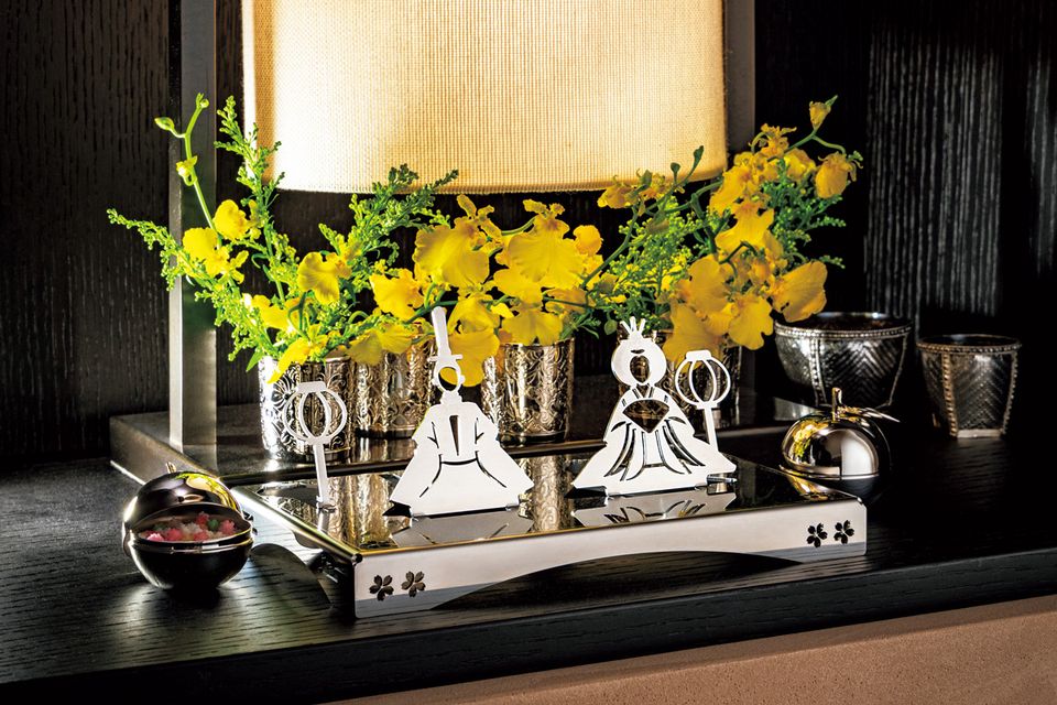 レーザー刻印で輪郭や髪飾りを描くなど、金属ならではの凜とした存在感も魅力。シルバーやステンレスのアイテムをまとめた空間に置くのはもちろん、少し暗い棚の中でもキラリと映えて可愛らしい、“現代雛”の世界観が広がります。