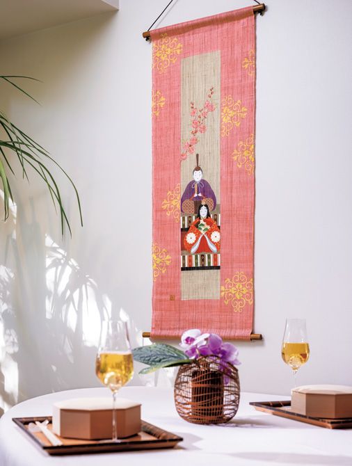 天然手織りの麻布に、たおやかな笑みを湛える殿と姫が一点一点、「京都洛柿庵」による手作業で丁寧に描かれたタペストリー。背景には、ろうけつ染めと手彩色による花菱文様があしらわれ、さりげない華やぎを添えています。「壁に掛けるだけで設置できるので、家具を増やしたくないお部屋でも気軽に楽しめて、なおかつ空間の雰囲気が一気に変わるのはタペストリーならでは」(横瀬さん)。インテリアにもなじみやすいため、初節句や出産など、お祝い事の贈り物にも最適です。「ろうけつ染めタペストリー短冊桃雛」(幅45 × 長さ120センチ)3万1680円(梱包配送料込み)