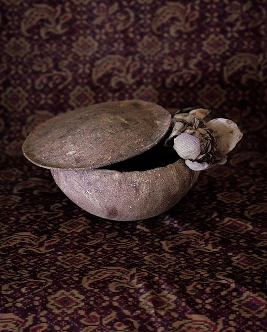 薬師寺東塔の基壇の土は、赤土と白土、砂と砂利を混ぜた、現代のコンクリートのような組成だったとか。すべてを損なわないように丁寧により分け、土をひたすらのばして「焼締有蓋壺」は作られた。「土に何かを加えようとか、表面に塗ることも一切省いて、作り手の職分である『形』を作らせていただくことにのみ徹した」(川瀬忍氏)。インドネシアの古い更紗がその深遠な趣を一層際立たせる。