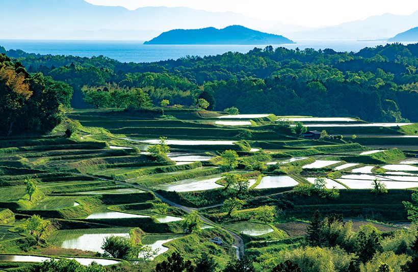 5月、田植えの頃の広々とした仰木地区の棚田。比叡山に向かって流れる天神川・大倉川沿いの田んぼは、日当たりが良く長年フィールドワークをしてきた場所で光の田園と呼んでいる。ここでは、今でも昔ながらの風景を楽しめる。