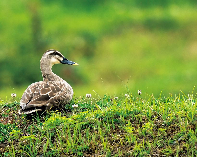 土手に目をやるとカルガモが休んでいました。どこかで巣を作っているようです。