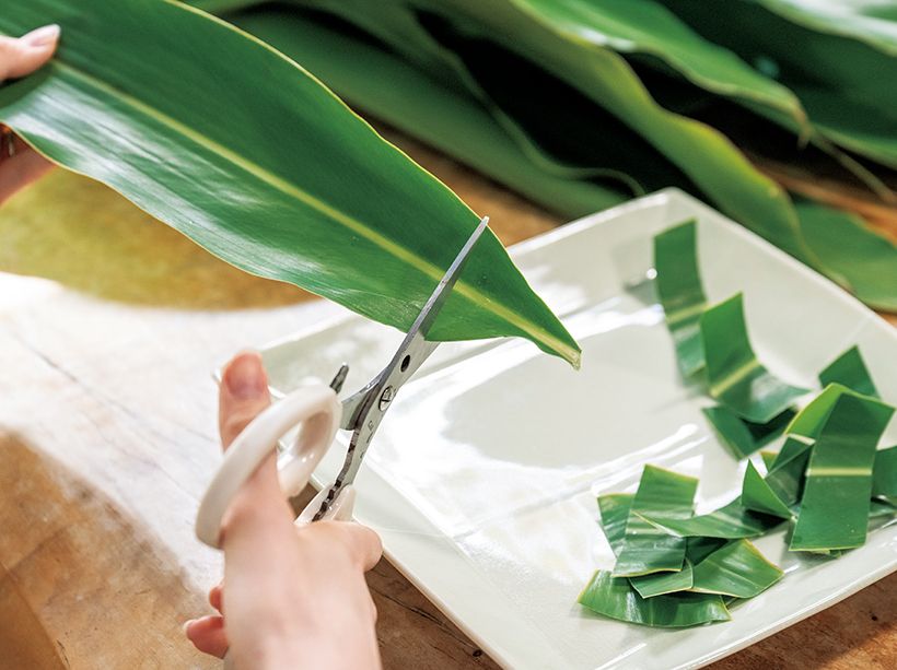 作り方(1)月桃の葉を1.5~2センチ幅にはさみで切る。