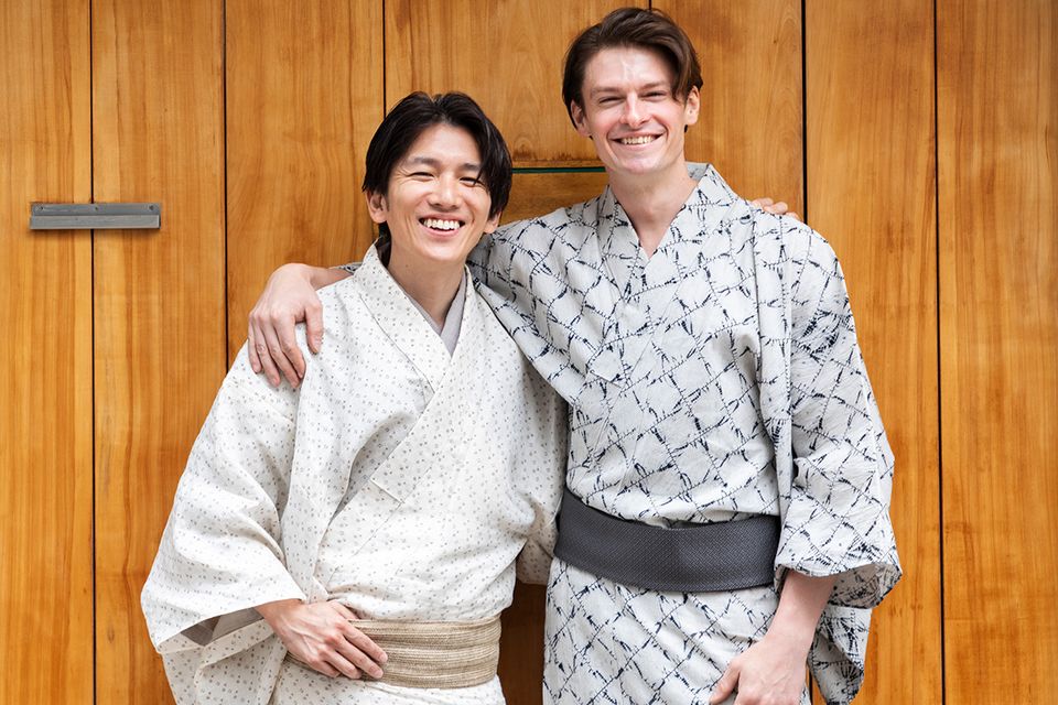 きもの選びのアドバイスいただいた泉二啓太さん(左)の装いは八重山上布。