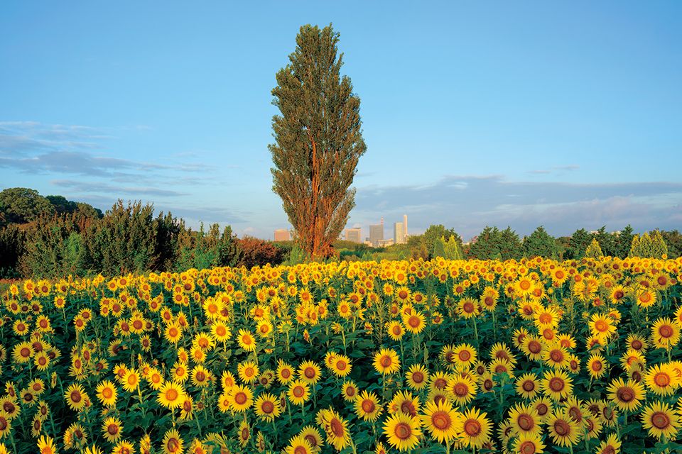 約1500平方メートルの遊休耕作地を活用し、景観保全の一環として整備された「ひまわり畑」が9月に見頃を迎える。遠く向こうに見えるのは、さいたま新都心のビル群。中央にそびえるポプラの木は、見沼田んぼのシンボルの一つ。