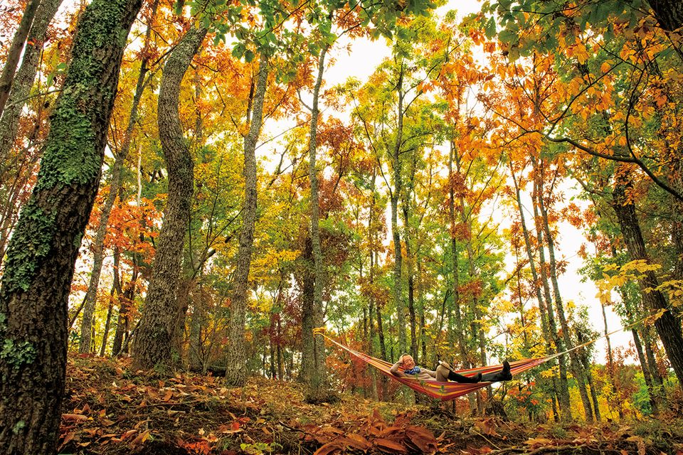アトリエの雑木林は、晩秋には、美しく色づく。ハラハラと落ち葉が舞う音を聞きながらハンモックで寝そべるのはとても気持ちいい。このハンモックは、20年以上前、アマゾン川を取材したときに、現地で手に入れたもの。簡素な作りだが長持ちする。
