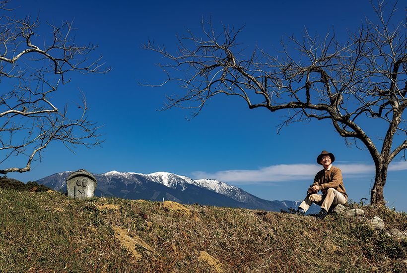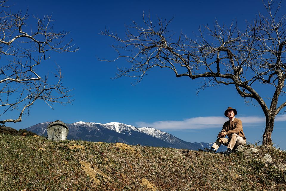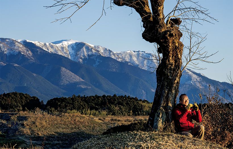 「オーレリアンの丘」で早朝に野鳥を観察する。私がもたれている渋柿の古木は、45年間放置された竹林の中に人知れず隠れていた。丘では、比良山地と「光の田園」を見渡すことができ、清々しい風が吹いている。自宅から近く、お気に入りの場所のひとつだ。