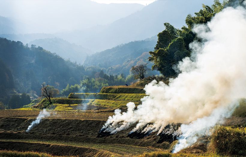 もくもくと白煙が立ち上る、今年最後の土手焼き。風がない日に行うので「光の田園」の谷に乳白の煙が沈着し、霧がかかったような風景になることも。刈田に染み付いた香ばしい匂いが冷たい風に持ち去られると、本格的な冬の訪れだ。