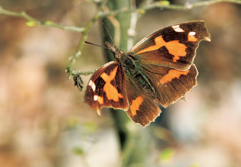 12月になっても暖かい日には、ユニークな文様をもつテングチョウに出会います。雑木林の縁の枯れ葉や小枝の中で越冬しているのですが、太陽の光がさすと、翅を開いて日向ぼっこをします。