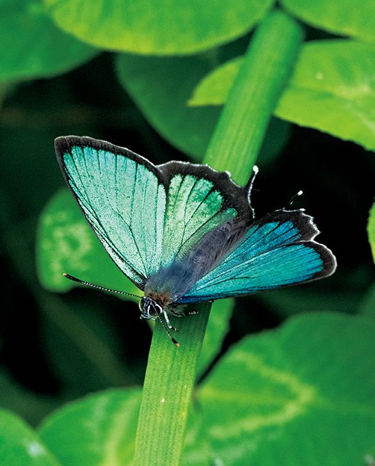 ゼフィルスの仲間であるミドリシジミ。オスの翅は、金緑色に輝きたいへん美しい。幼虫は、ハンノキの葉を食べる。