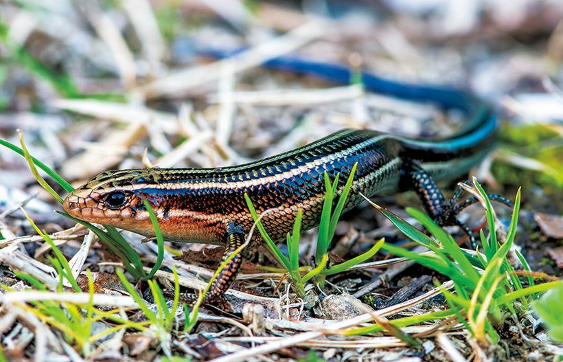 ニホントカゲは、初冬に枯れ草の上で休んでいる姿を見かけます。本格的な寒さがやってくると、土の中の浅いところに潜って春を待ちます。