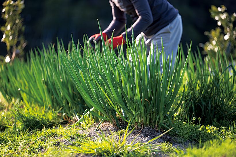 ねぎ畑で、太くなった葉を選んで切り取ってゆく。ほとんど手間いらずの野菜だが、これらのねぎは、晩秋にすべて掘り出して、場所を変えるようにしている。