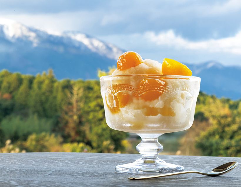 蜂蜜漬けの金柑をのせたシャーベット。背景に見える雪山は比良山地。