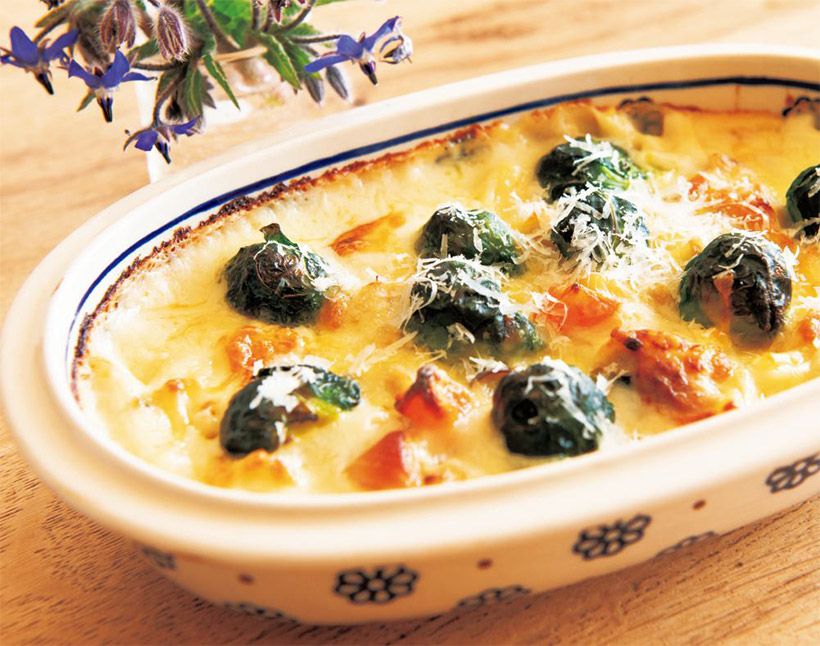 (10)(9)をグラタン皿に流し入れ、上に(4)の芽キャベツを並べ、250度に予熱したオーブンで約5分、表面にこんがりと焼き色がつくまで焼く。仕上げにパルミジャーノチーズを削りかけて完成。