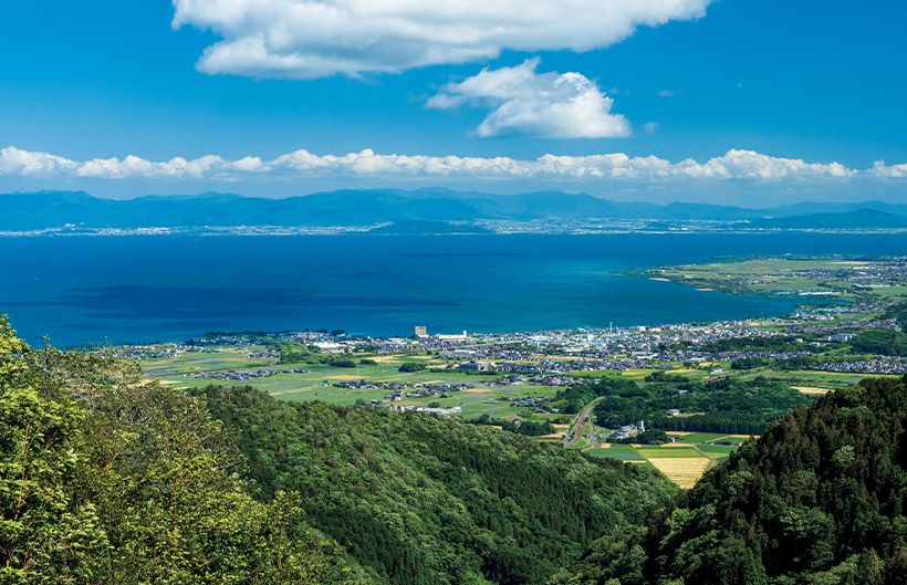 箱館山から見下ろした湖西の遠景。真っ青な琵琶湖が山々に囲まれていることが実感できる。西部地方は、湖と山が迫っているので、絶えず水の流れを感じられるところが最大の魅力だろう。