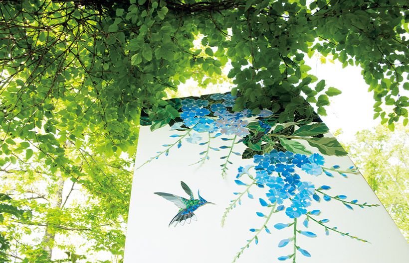 ハチドリは、中南米を取材していた時によく出会った野鳥。体長が数センチほどしかない可愛らしい鳥で宝石のように輝く。南米原産のデュランタの花にやってきたところを切り絵で表現した。