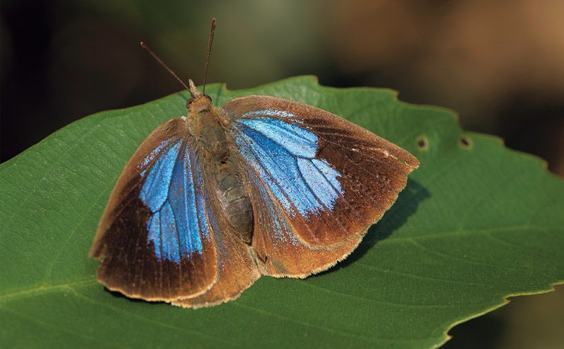 美しい青紫色の翅を持つムラサキシジミは、アカガシなどの葉裏に身を隠していましたが、暖かい太陽の光に誘われて翅を開いて気持ちよさそうです。