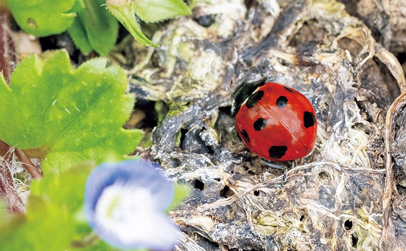 早春は、越冬していた生きものたちが目を覚ます季節。裏の畑の散策がとても楽しくなります。ナナホシテントウは、枯れ葉の裏に隠れていたのですが、暖かくなると草の上で日向ぼっこをするようになります。すごく鮮やかな紅色なので目を引きます。