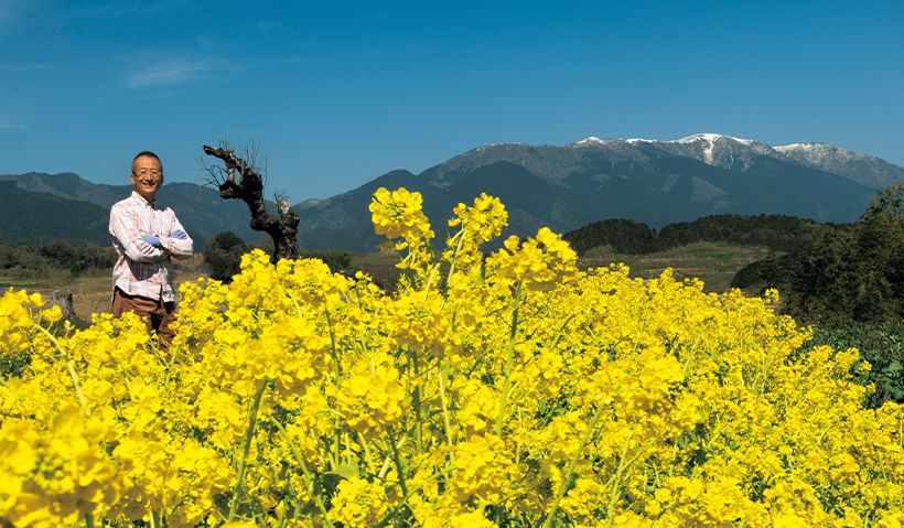 仰木地区にある菜の花畑は、30年くらい前に比べると少なくなりました。私が写真を撮りだしたころは、菜の花が黄色いベルトを作っていて目を楽しませてくれたものです。昔は、菜の花から菜種油を採っていました。手作業で圧力をかける搾り方なので、畑の面積からするとほんのわずかしか採れません。このような純正の菜種油は、今では大変貴重なものになりました。私にとって菜の花畑には、失われてゆく風景を取り戻したい、そんな願いが込められています。