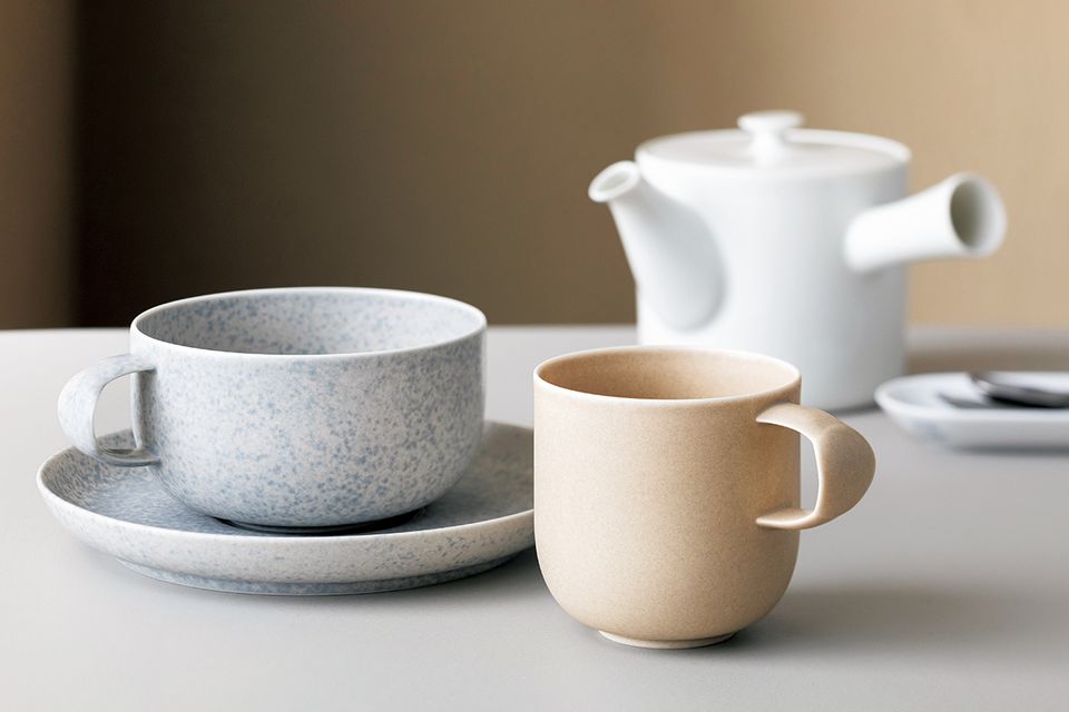 写真上は左からティーカップ「CUP(カップ)95」(3630円)とソーサー(1650円)、コーヒーカップ「CUP(カップ)65」(2860円)。後ろは定番の「kyu-su(キュウス)」(L、8800円)。