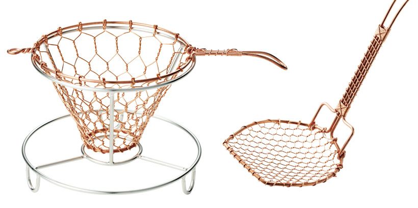 辻和金網の金網細工(小山さん選):1933年の創業以来、針金を一つ一つ手で編み上げる伝統技法で、日々の道具を仕立ててきた「辻和金網」。編み目は、六角形が連なる美しい亀甲目。用途に合わせて針金の太さやねじりの回数を変えるなど、職人の繊細な感覚が生きている。金属でありながら柔らかさと温かみを宿す道具は、壊れても修繕でき、長く使い続けられる。上・「手編みコーヒードリッパー(大)」(直径10×全長18×深さ6.5センチ)7700円 下・「ゆどうふ杓子(六角大)銅」(6×7×長さ20センチ)2640円/ともに辻和金網