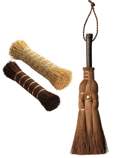 桔梗利 内藤商店の箒(小山さん選):創業207年。京都・三条大橋のたもとに店を構える「内藤商店」は、初代の家訓「品質を看板に」を守り続けている。余計な装飾を省き、機能美に徹した箒はすべて手作業で製作。大量生産による簡略化を避け、使い手の声を生かしながら職人が改良を重ねてきた。その誠実なものづくりは、世界の職人やアーティストからも注目されている。右・「荒神箒大」(28×9センチ)3950円 中・「カルカヤキリワラ大」(15×3センチ)1750円 左・「棕櫚キリワラ」(13×2センチ)1650円/すべて内藤商店