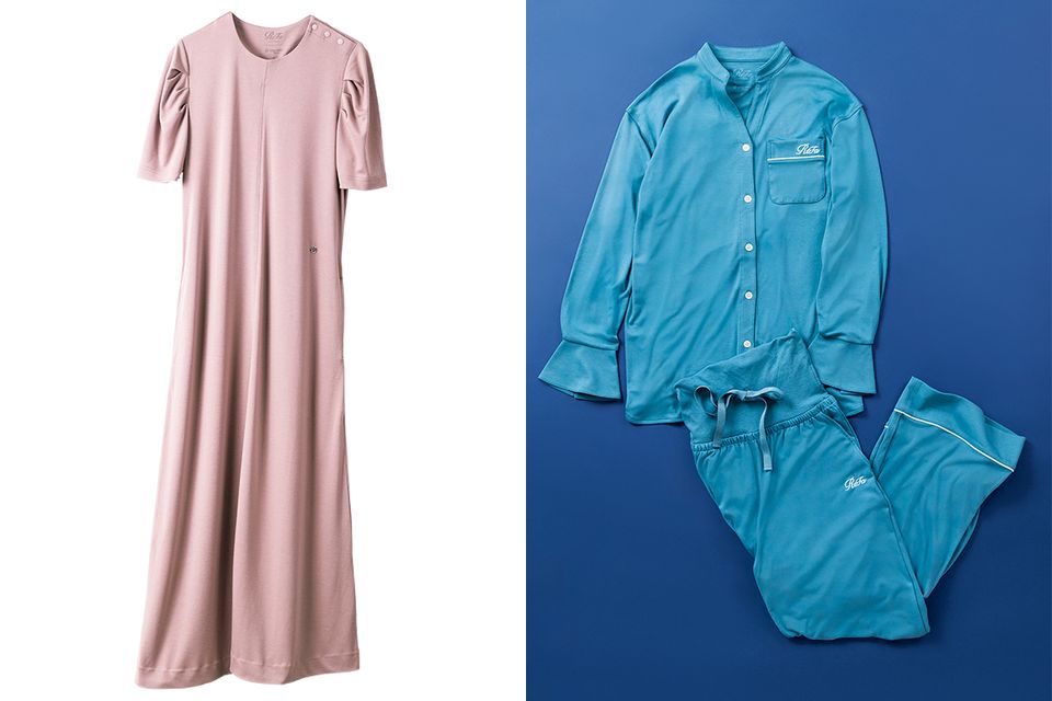上・「モイストスムース スタンドカラースリープウェア」3万8500円、下・「モイストスムース ギャザーショートスリーブマキシレングスシャツ」2万7500円。