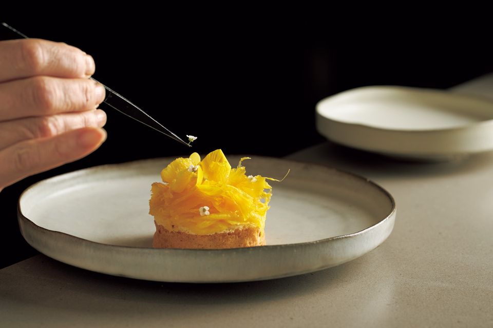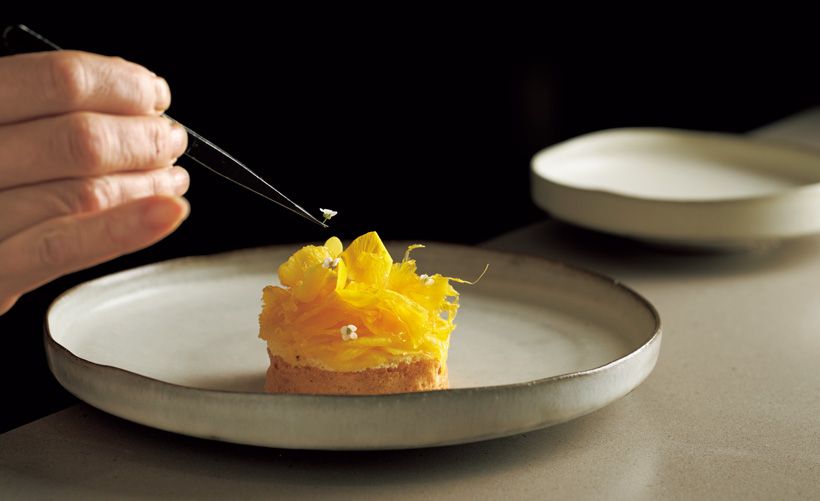 直線的な構造と曲線が作る“揺らぎ”が美しい皿にはフレッシュな果実と凝縮した果肉を重ねたパイナップルのタルトを。造形が完結しているものには、リムのある器を合わせることが多い。