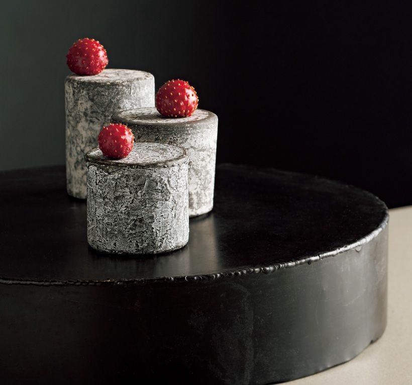 「石のような円柱は質量と時間を内包した存在だと感じました」と駒瀨さん。のせたのは、形を壊さず外側の細胞を保ったまま香りと味を凝縮させたいちごジャム。いちごの赤が、無機質な器の中に秘めた輝きを引き出す。