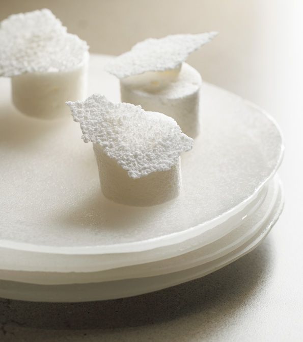 皿が持つ半透明の白を数枚重ねることで、マットで柔らかい白の質感が増し、のせたギモーヴと同調する。器の延長から生まれたようなデザートは、静けさと緊張感を感じる。