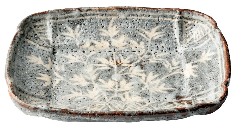 渋みのあるねずみ色に笹の文様が浮かぶ鼠志野の向付(縦13.4 × 横17.7 × 高さ3.8センチ)ミヤケさん私物。