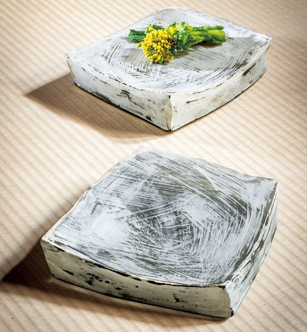桃山時代からの流れを汲む古志野ならではの柔らかな風情を再現しつつ、ねずみ色が醸すコンテンポラリーな雰囲気も感じさせる。「かぼちゃの煮物やしいたけの炭火焼きなど、シンプルな料理を盛るだけで絵になります」(ミヤケさん)。