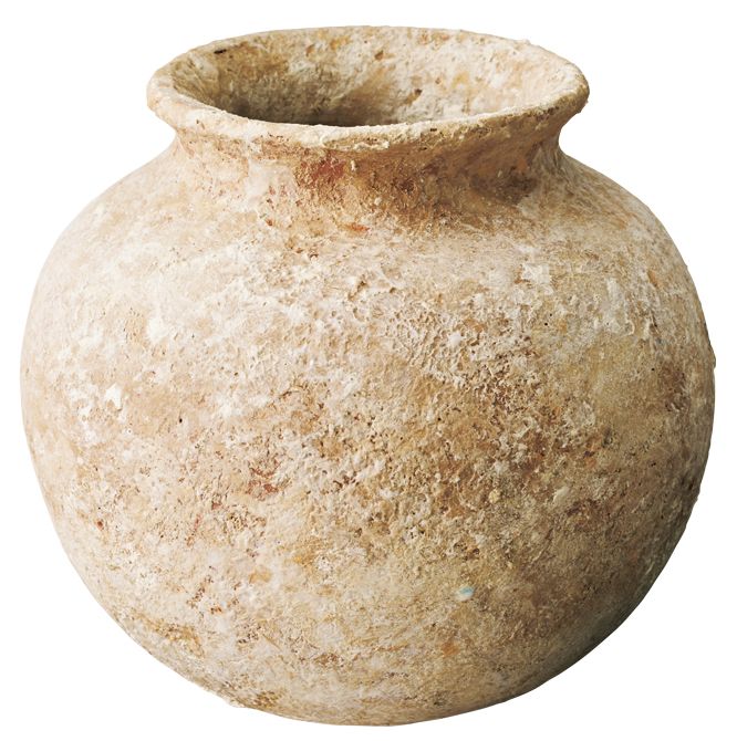 沖縄県八重山諸島の新城島で19世紀中頃まで焼成されていた「パナリ焼」に触発され、中国茶器や壺を作陶。泥に顔料を溶かし、スポンジで何層にも塗り重ねることで、自然の石や古物を思わせる質感を表現している。「南西諸島特有の技巧に走らない素朴さを直感的に捉えている」(原さん)。