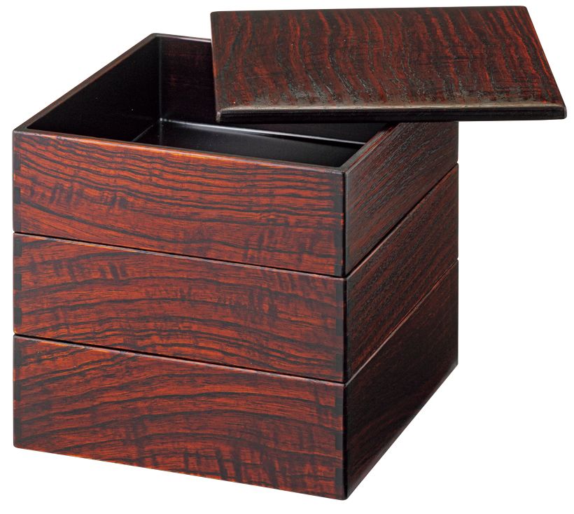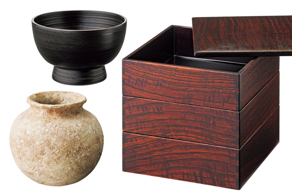 上・「六寸三段重箱(センダン)塗込拭漆」(幅18 × 奥行き18 × 高さ18センチ) 下・「四寸椀(リュウキュウハリギリ)塗込拭漆」(径12 × 高さ7.5センチ)