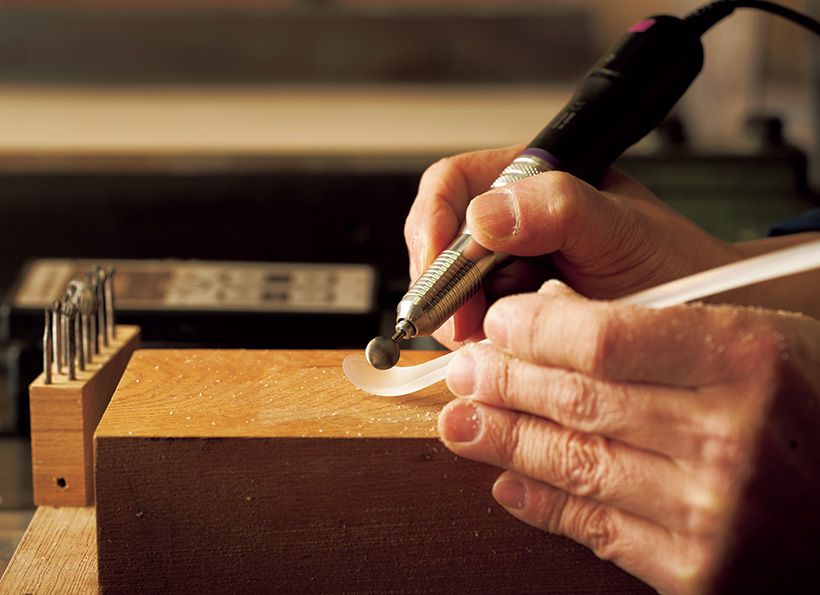 茶杓を削る俵藤さん。「竹と違い、薄くしすぎると割れてしまいます。茶杓としての機能と姿の美しさを微調整し作ります」。