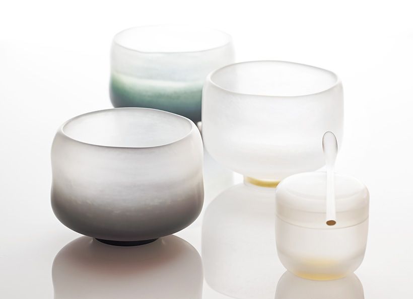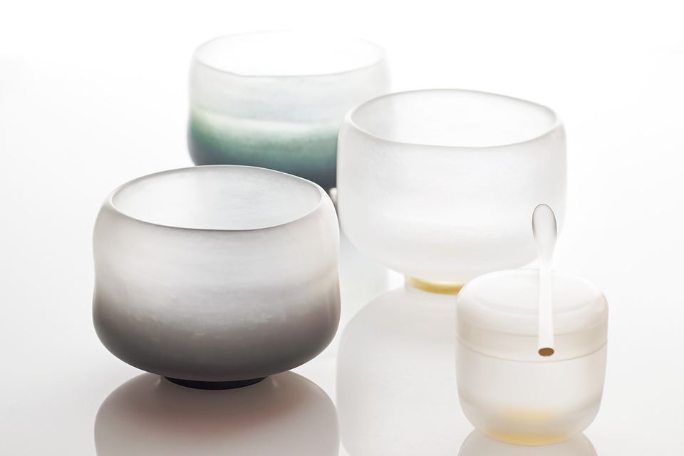 一見、フロストガラスで作られたような茶碗や茶器。これはアクリルで彫刻を作る俵藤ひでとさんの作品です。