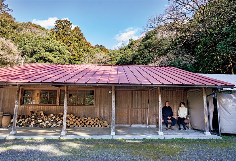 工房の外観。ベンチに奥様・るりさんと並んで。