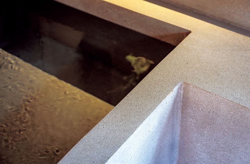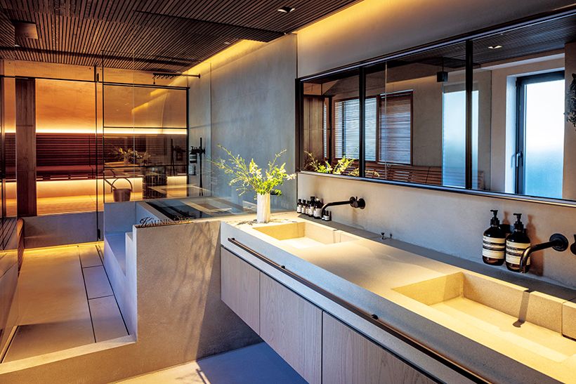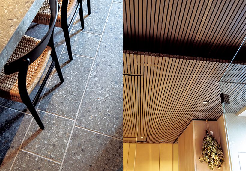 研ぎ出し、タイル、木材床には石調タイルを敷き、洗面台と浴室の造作には左官職人の手による研ぎ出し仕上げを採用。どこか懐かしさを帯びながら、なめらかで重厚な石の質感を備えています。「サウナ室はレッドシダーで統一し、天井は細幅材で和の趣を強調しました」(吉田さん)。天然の防腐・防虫性と、熱で立ち上る木の香りが心身を柔らかく包み込みます。