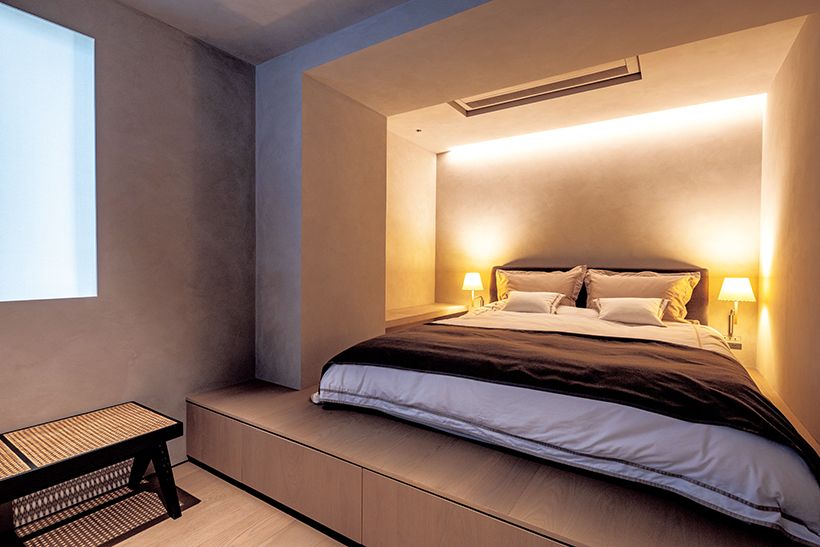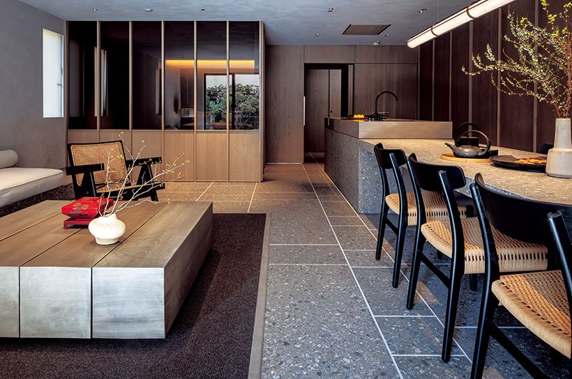 ガラスで部屋を繫げるリビングに隣接する主寝室は、濃色フィルムを施したガラスで仕切り、視線の抜けを確保しながらプライバシーと生活音を緩やかに制御。「純和風に寄せるのではなく、そこはかとなく和の気配を帯びさせたい」と谷尻さん。玄関から続くグレイッシュな石調タイルが空間を横断し、品格を保ちながら部屋同士を繫いでいます。