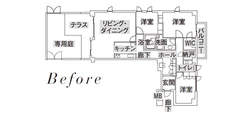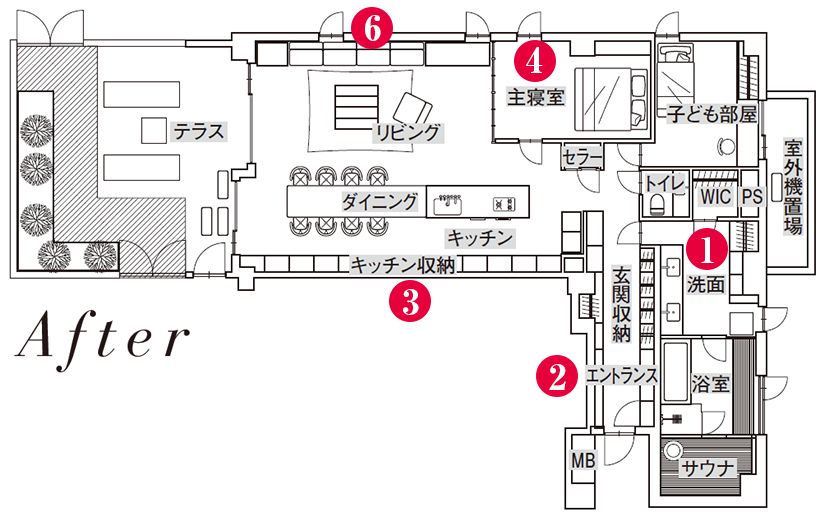 改修前は玄関脇の洋室だった空間を、サウナを核に水回りを集約した間取りへと刷新。マンションでのオーダーサウナは電力容量の制約や、コンクリート軀体に新たな開孔ができないという課題も伴います。「既存の開口を生かして配管や室外機の経路を確保するなど、制約を一つずつ解消しながら本格的なサウナを実装しました」(谷尻さん)。(図面作成/ワークプレス)