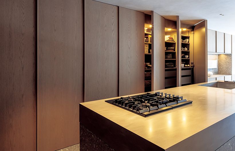 家電・冷蔵庫は見せない冷蔵庫や家電は背面の壁の内側に格納。この家のために造作したオリジナル収納にはオーク材を用い、木目の凹凸を生かす目はじき仕上げで立体感を際立たせています。レンジフードも天井内に納め、視界に入る情報を削ぎ落として、空間をすっきりと。茶道具は壁の内側やテーブル下に収め、所作の美しさが自然に立ち上がる構成となっています。