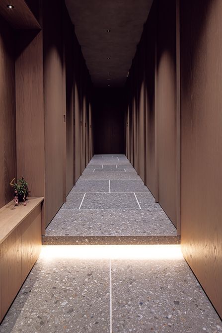 陰影をつけて幅の限られた玄関から続く長い廊下を、あえて魅力あるものへと発想を転換。特定の範囲だけを照らす局部照明で、暗がりを意図的に残して陰影をつけ、空間にリズム感と奥行きを生み出しました。光を均一に行き渡らせるのではなく、明暗の差をつくることで視線を誘導し、歩みそのものに高揚感を与える手法です。